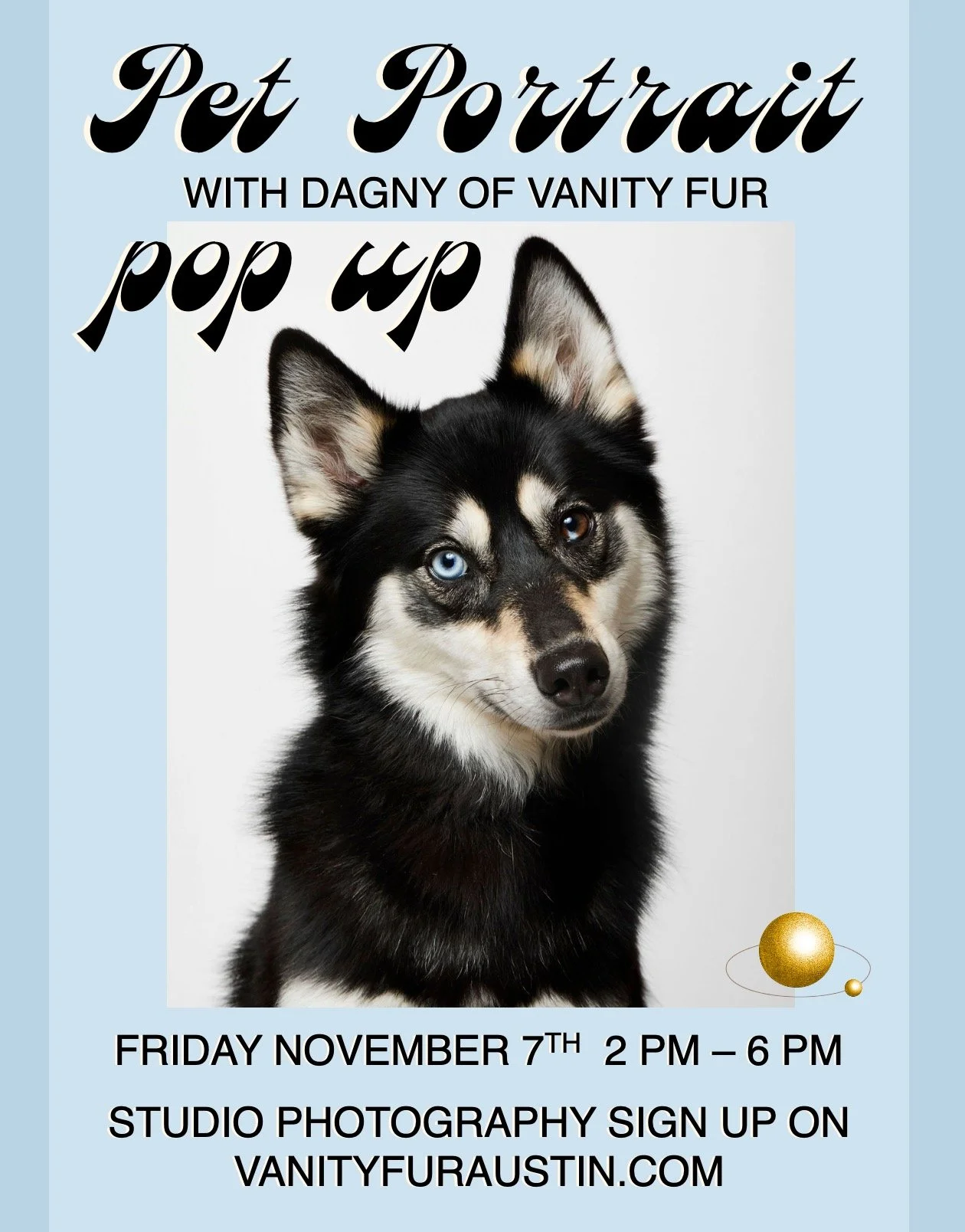 PAW-POP This Friday November 7th from 2-6 pm with Vanity Fur! Bring your fuzzy best friend for a studio portrait at Golden Mean! Sign up to secure your desired time (link in our bio) or Walk Ins Available.